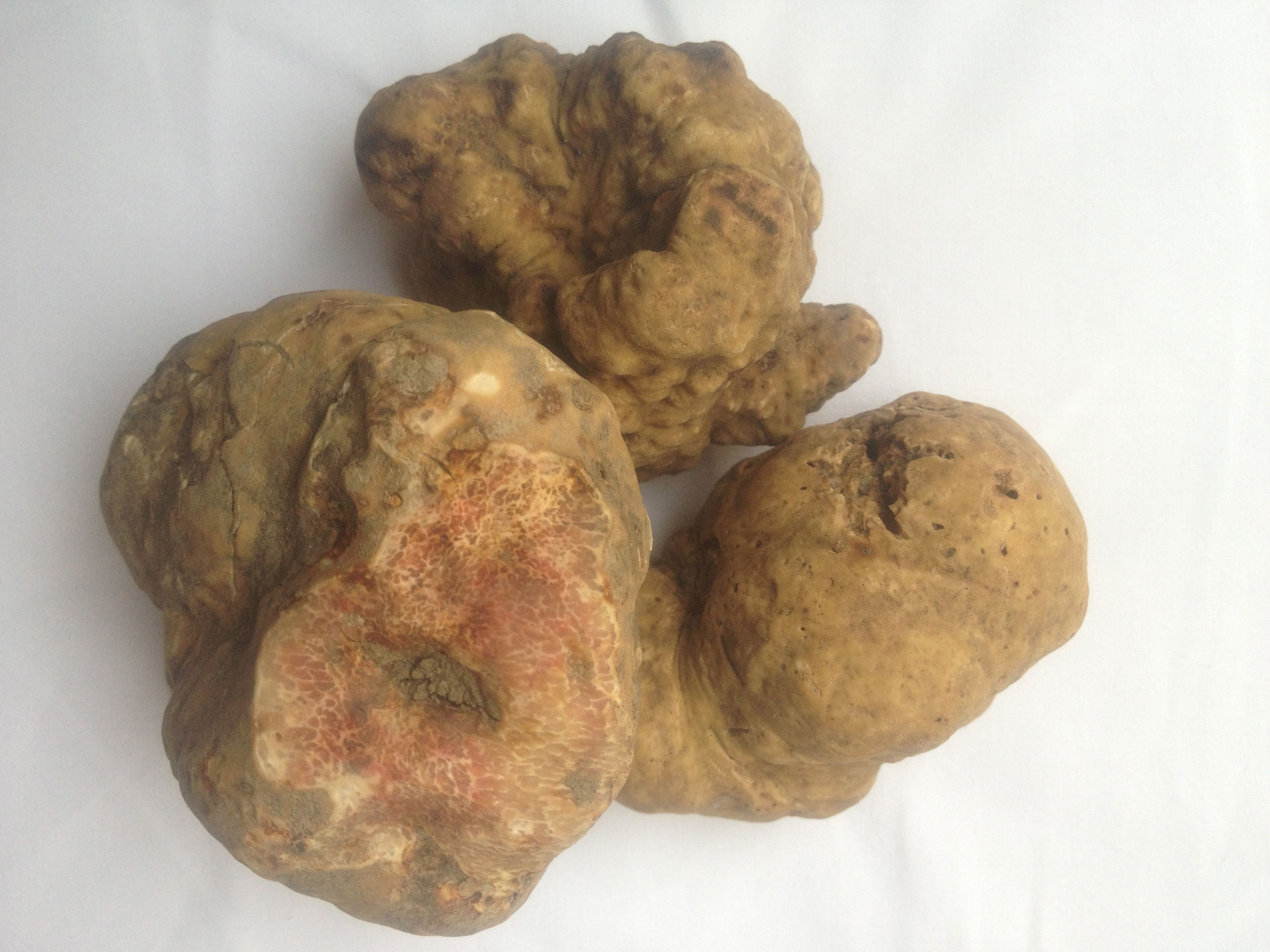 The white Alba truffle gets a different color according to the kind of tree it lives and grows with. So its color varies from white sometimes with pink veins  to grey verging on brown. The mycelium finds the right conditions to produce the truffle mainly about the roots of a few plants like the poplar, lime, oak, willow, and in the opinion of some people even the vine.