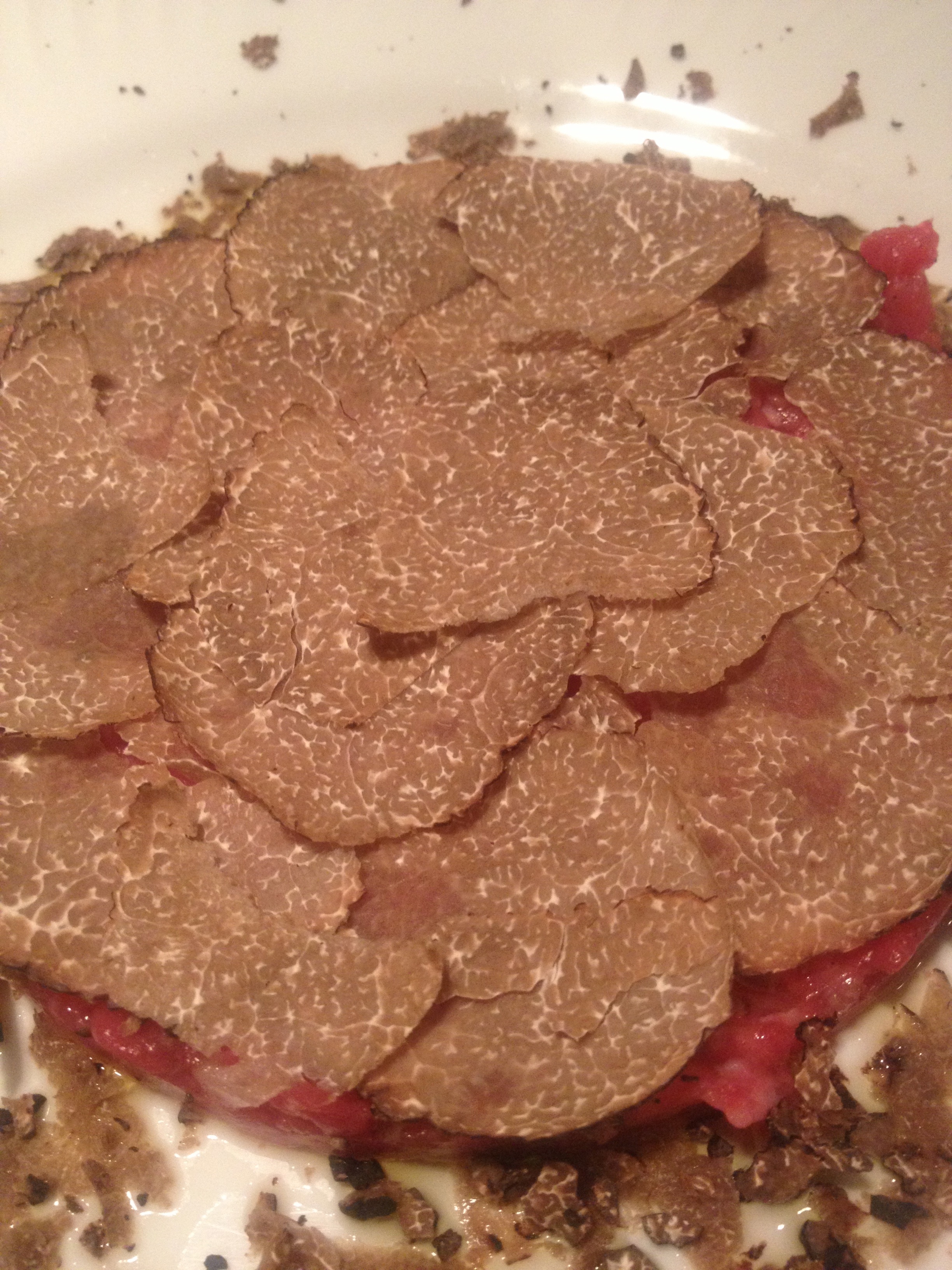 When it comes to truffles it is difficult to tell without getting up close. This in fact is a black shaved over and on raw beef. Once you taste it, you immediately can tell the difference and although this is obvious; you cannot easily tell by sight. Don’t misunderstand, there is no comparison.