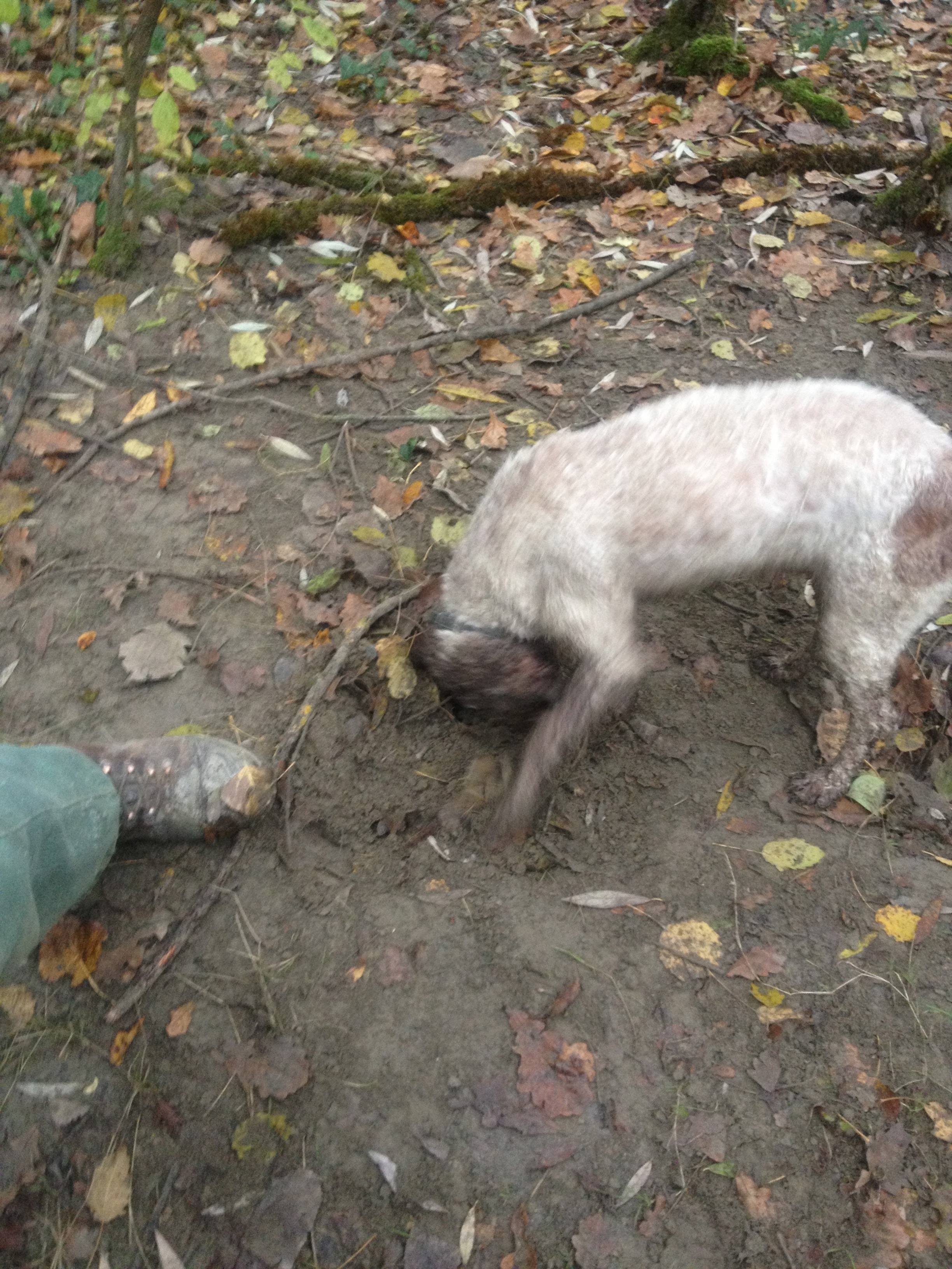 We wait and listen and no dog, after 15 minutes we are instructed to return and bring some cigarettes, so he can wait for Poopee’s hopeful return. He has no cigarettes left and he needs to smoke. As we turn to go, there is a noise, a ruffling of the forest’s floor and in the distance we hear the dog. Without any hesitation, the owner stands in disbelief and the dogs re-appears.