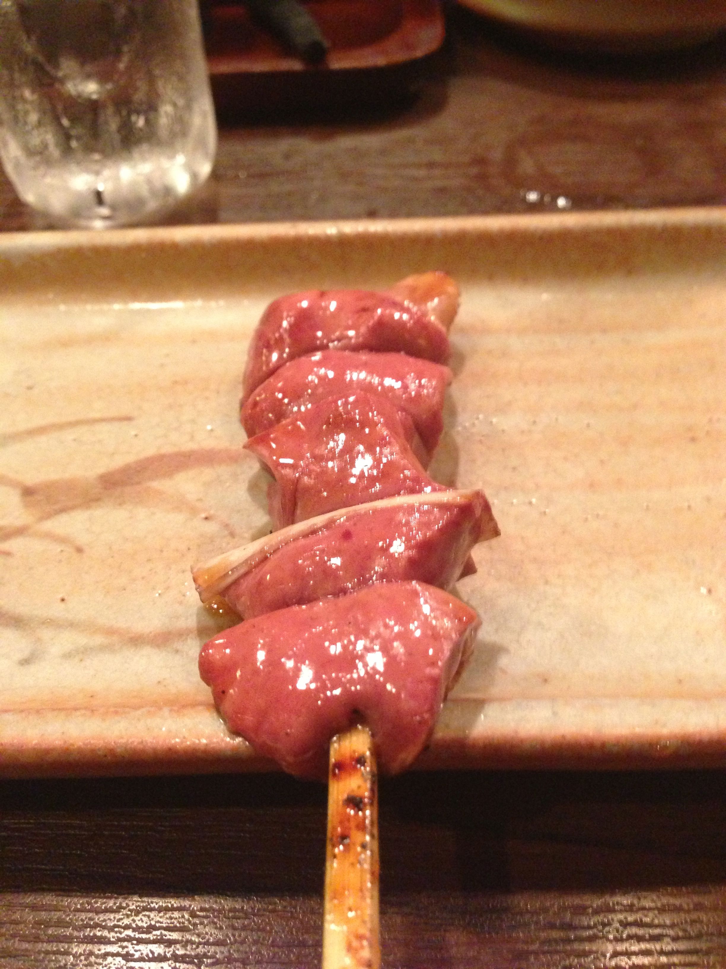 There is something about yaki-tori that is signature. You need to understand that Japan’s restaurants and chefs focus on one food, at one time. This means that a chef has little leeway and margin of error and is judged on the basis of his true skills and raw ingredients. Especially in the case that many foods in Japan are “raw” and so technique and materials combined with experience is essential. Above is pictured one of my least favorite innards of the chicken but, and I say but, this liver is incredible. Silky and no odd, or off taste that you usually find in liver or that iron taste. It is purely delicious.