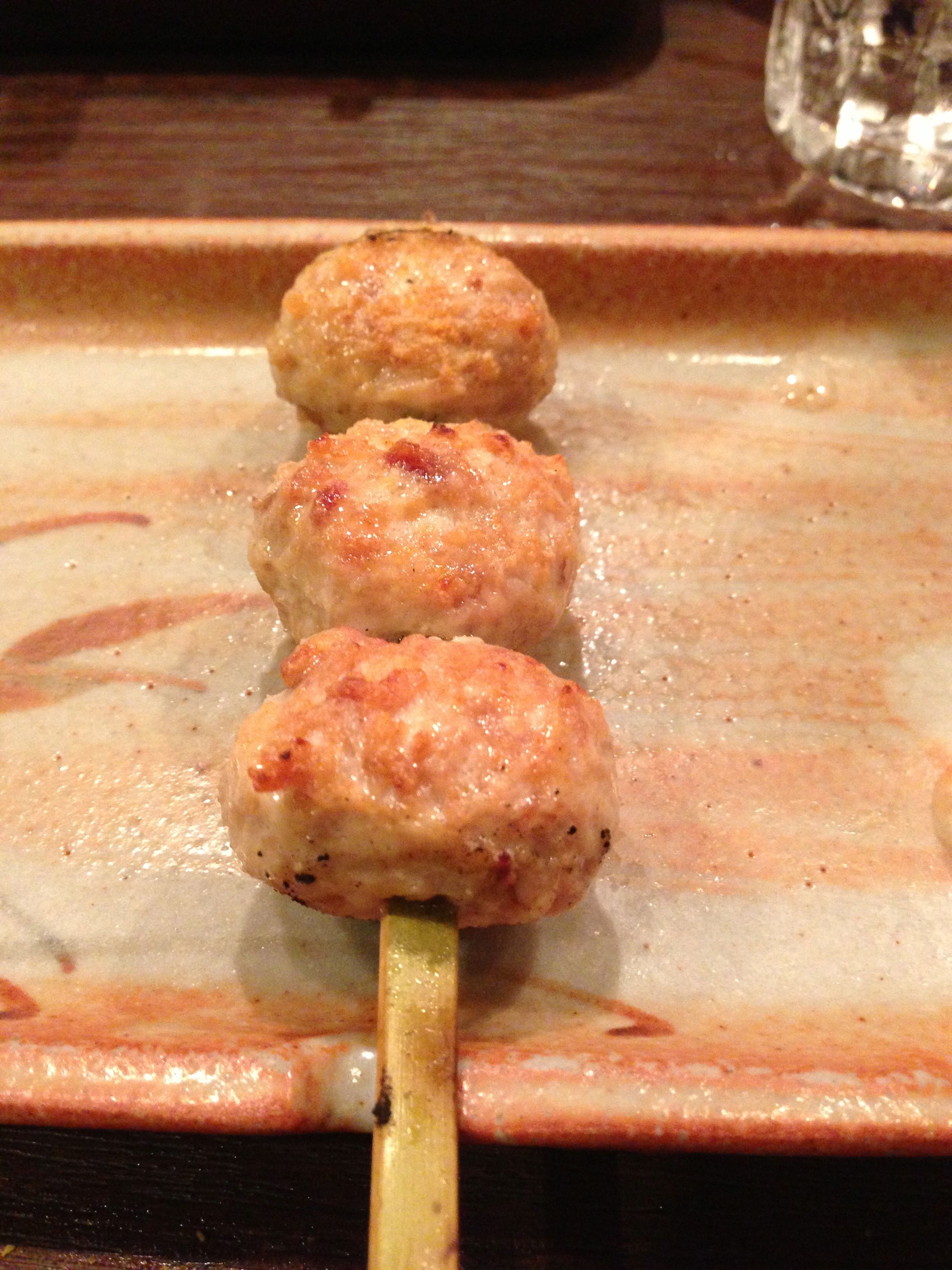 There are different ways to make meatballs, a.k.a. Tsukune. The meatballs are prepared like most meatballs, minced meat. Now if you have time, take a look at the internet and pictures of yakitori meatballs. Most if not all have a charred look and that is the difference here. This chef is careful in his preparation not to use, tare, pronounced like the word “tar” and “eh”, just like the Canadians say.