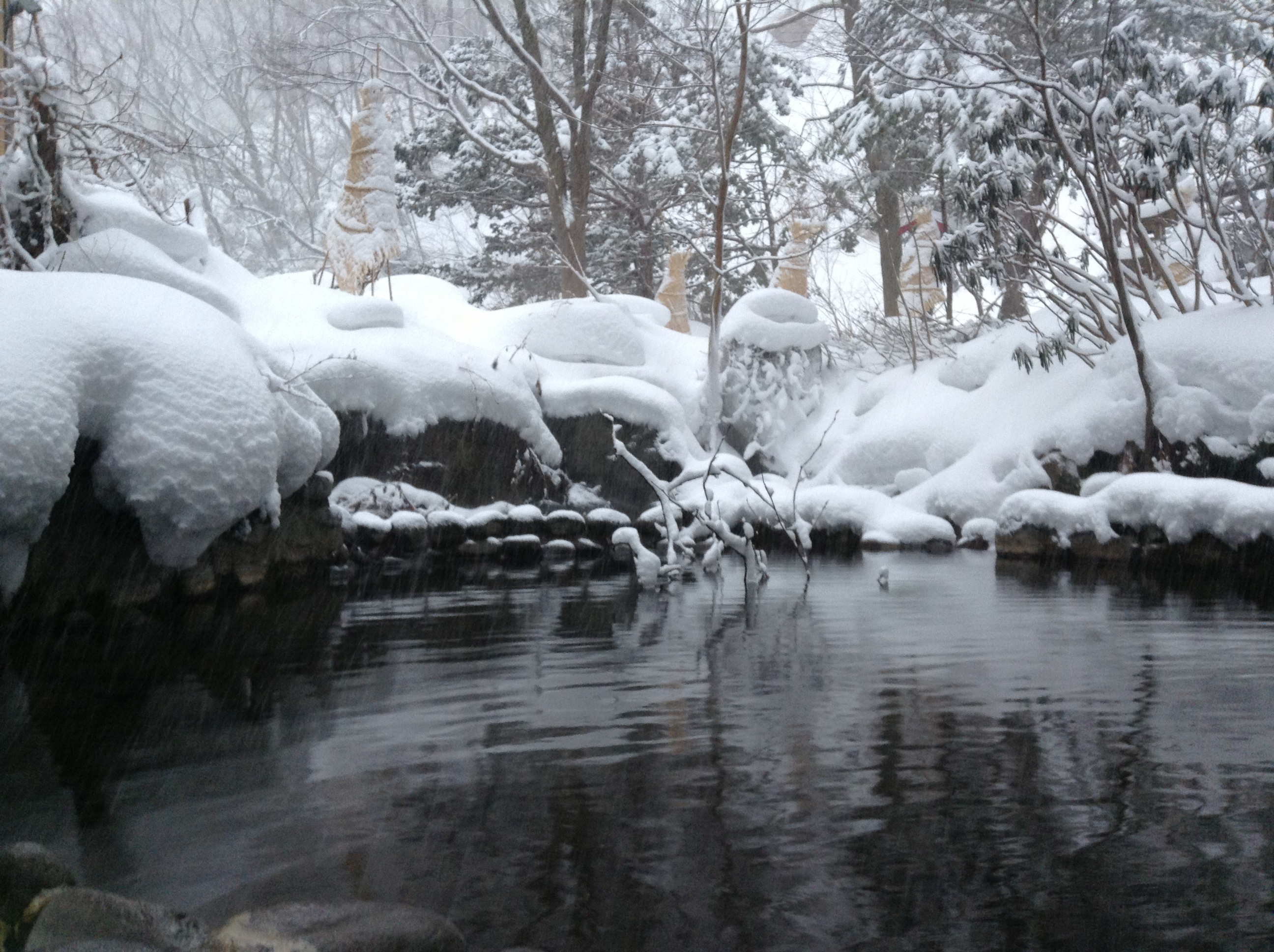 Today it was snowing moderately but enough snow fell yesterday leaving a solid 35cm and fresh snow was falling all morning. The temperature was minus 5C and the wind was blowing an air chill. Coming from the onsen waters @ temperatures of 42C, the air was still frosty. The setting was white pretty and the fast running water from the creek was brisk. A shower of cold water combined with the milky waters was exhilarating.