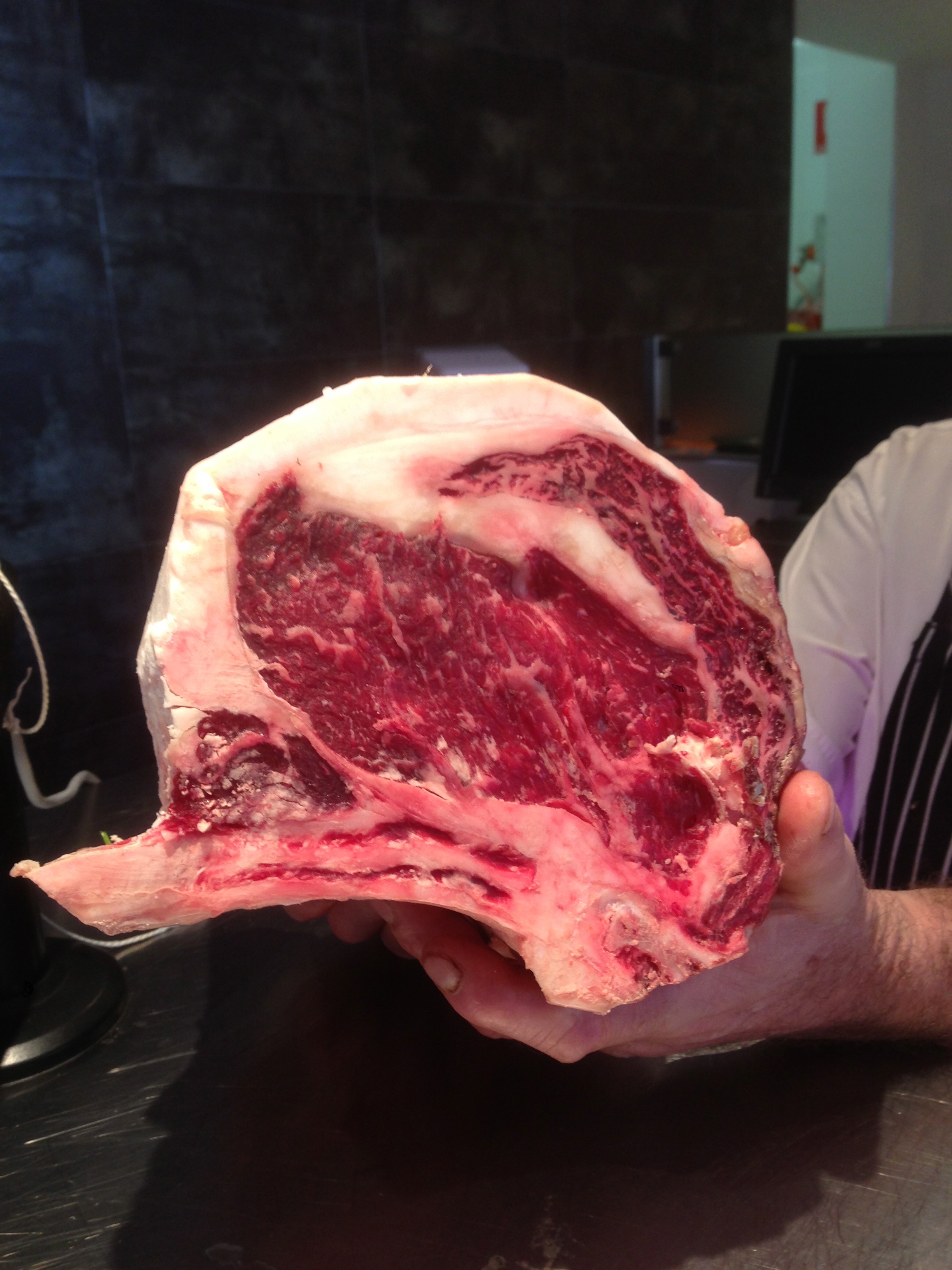 In the background the Adams family is playing this is a lovely T-bone. I am told it has good age of 10 weeks+. The cap is crystal clear and the center cut is well marbled yet the fat is a little irregular which can cause some strings of fat. The beef smells sweet and the taste is excellent.
