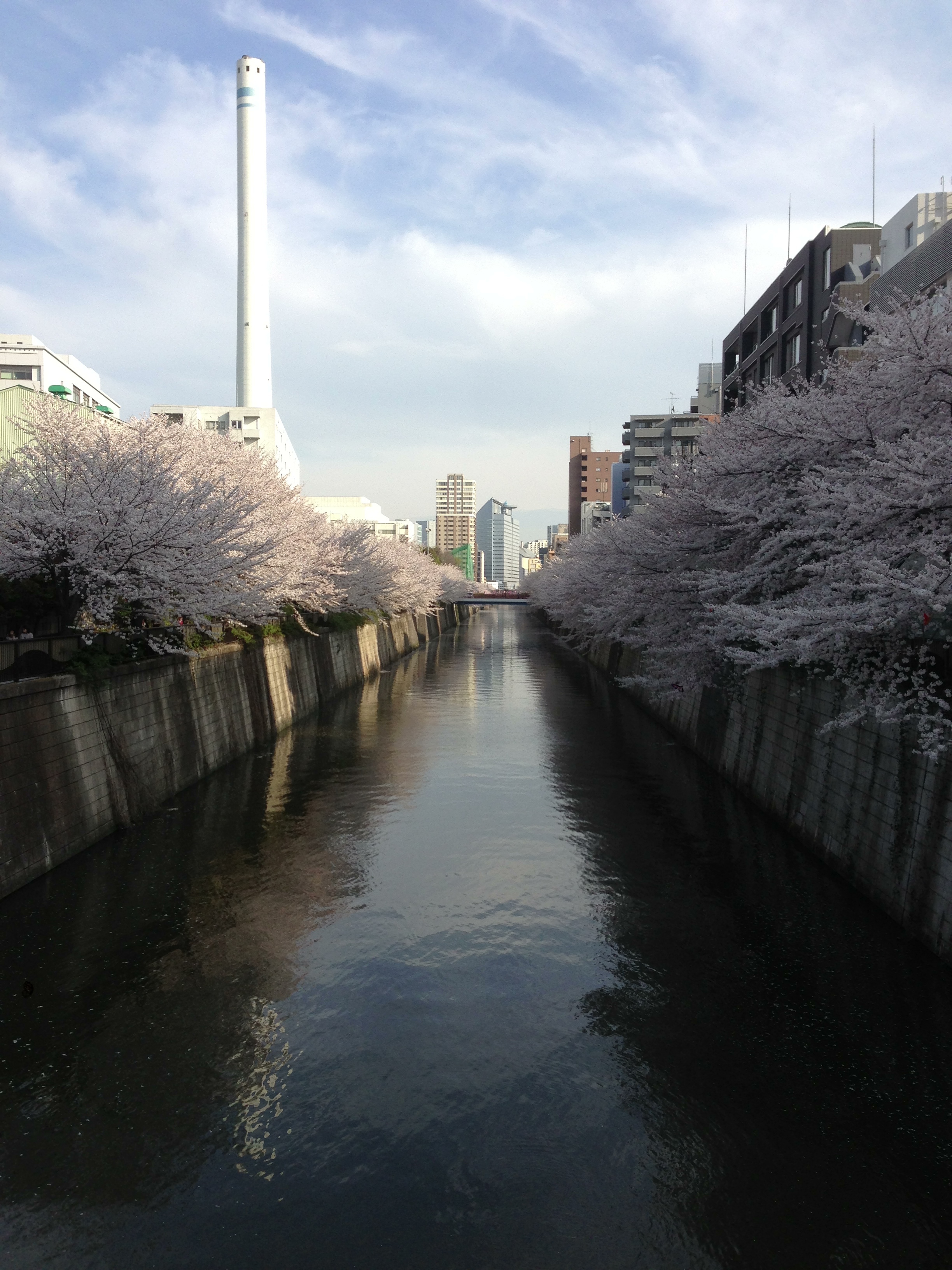 This is the full blossom of Sakura as it reflects a soft pink color against a blue sky and a dark river. The motion seems still as the tower in the background is a contrast of nature’s way of saying help.