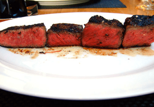 The greatest challenge in grilling is controlling temperatures and controlling radiant heat can be a challenge. I entered the kitchen of “cut” to see how they finish their steaks and it is in a salamander grill, radiating heat from above and below. If you look at the steaks below in second photo, you’ll see the surface totally blackened. One reason is the salamander is open and the “sweet spot” is through trial and error and up to the chef. The problem with a salamander and steak is, after grilling the steak has darker areas on its surface, i.e. the steak develops dark char lines. These char lines actually absorb the incoming infrared radiation, as the dark surface scatters less radiation and heats up more quickly. A broiler or Salamander can easily burn foods as the dark surface soaks up energy and heats up by accelerating the cooking time.