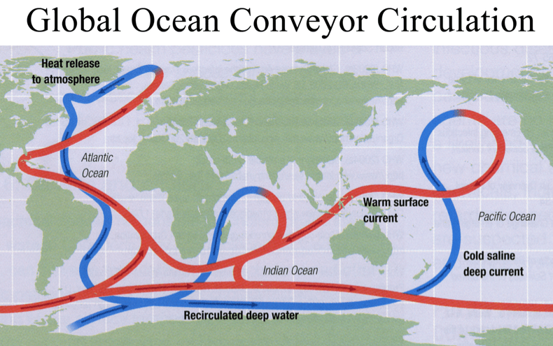 It is a global network of density-driven ocean currents transports a tremendous amount of heat northward, keeping the North Atlantic and much of Europe up to 5°C warmer, particularly in the winter. A sudden shut down of this current would have a ripple effect throughout the ocean-atmosphere system, forcing worldwide changes in ocean currents, and in the path of the atmospheric jet stream.