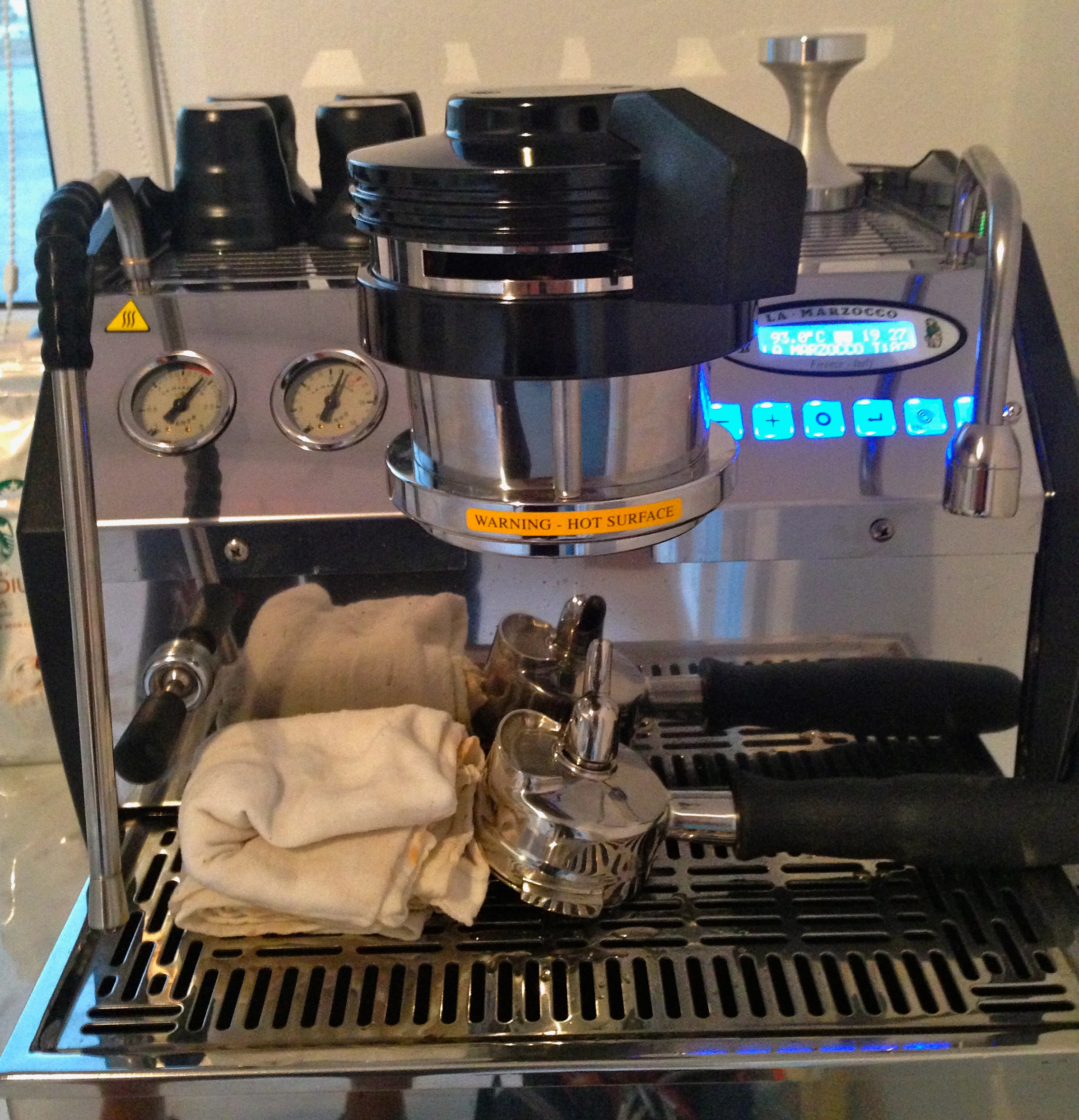 The GS3, a machine to produce an Italian coffee espresso with two boilers. The mechanical paddle leverages the pressure as you paddle it from right to left. The pressure reaches a maximum of 12bar and this percolates the coffee at 94 degrees centigrade. A fantastic machine and thanks to JM.