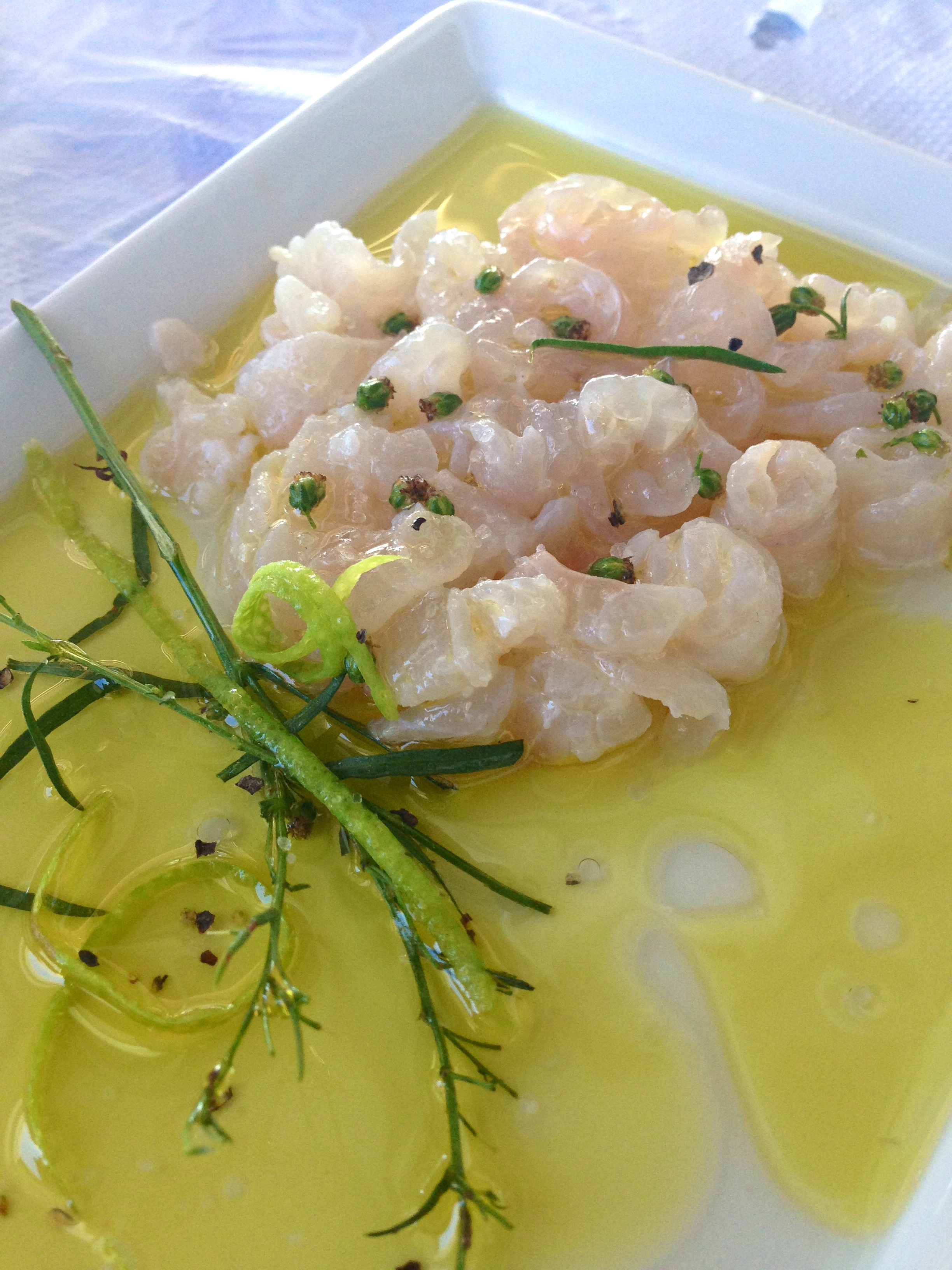 After 30 years I taste a fish I never tried! The Drakina fish has a head like a snake, it is ugly and the chef/owner Adonia of ToThalassaki doesn’t like to see it – so she cuts the head off. Typically a fish for soup, local fishermen use it. It is prepared with salt, sugar, raki, and anise seeds. It is marinated (2) hours and then served raw. If marinated more it gets very tough. A dish only for fish-experts and not on the menu.