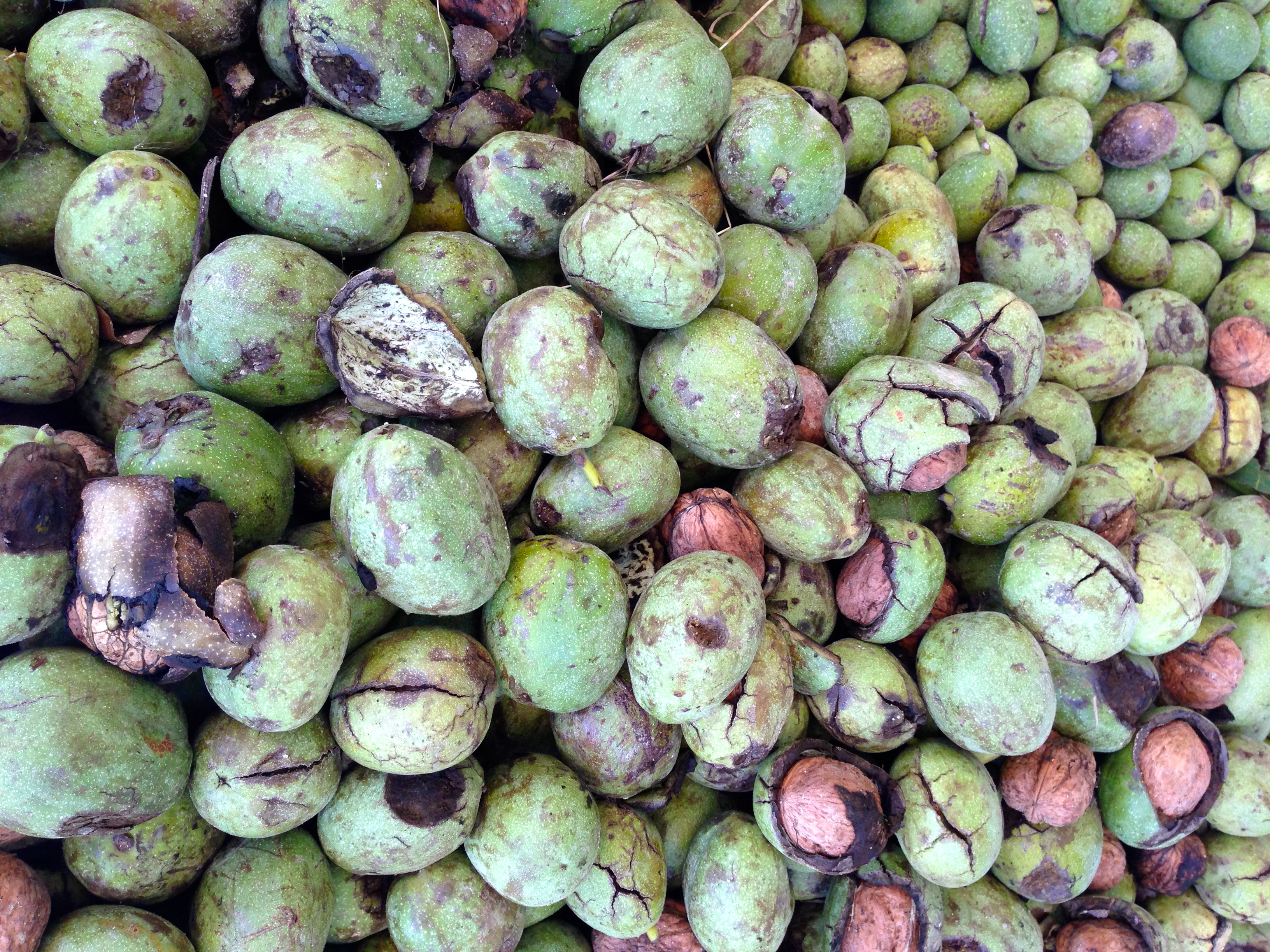 There are two types of Walnuts, English from Persia and the Black from North America. The picture above is fresh Persian Walnuts from Turkey. The green husk is inedible and after peeling it, you find an edible seed.