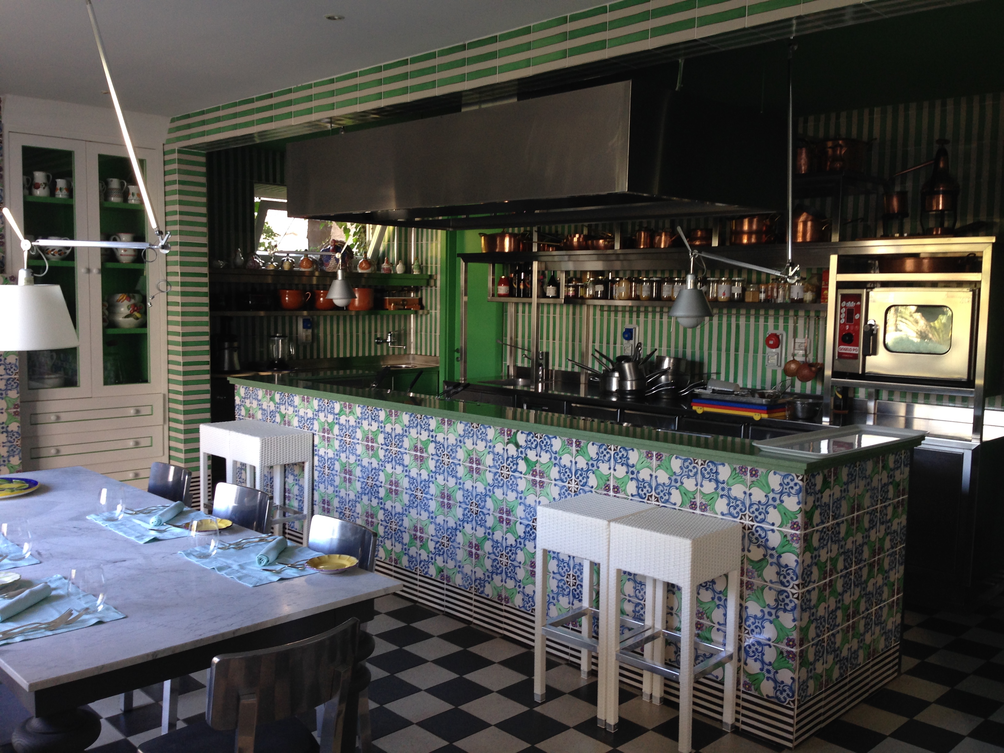 The cooking classes, are casual, you cook, eat and drink, held in a dedicated space aside the property adjoining to the gardens. The kitchen has two tables, one set up for us, the other ready with menu, recipes and white kitchen jackets. We were a small group of four, two kids and us. Usually the classes are open to guests and signing up is easy. In our case, we were a private group and today we learned pasta and gnocchi.