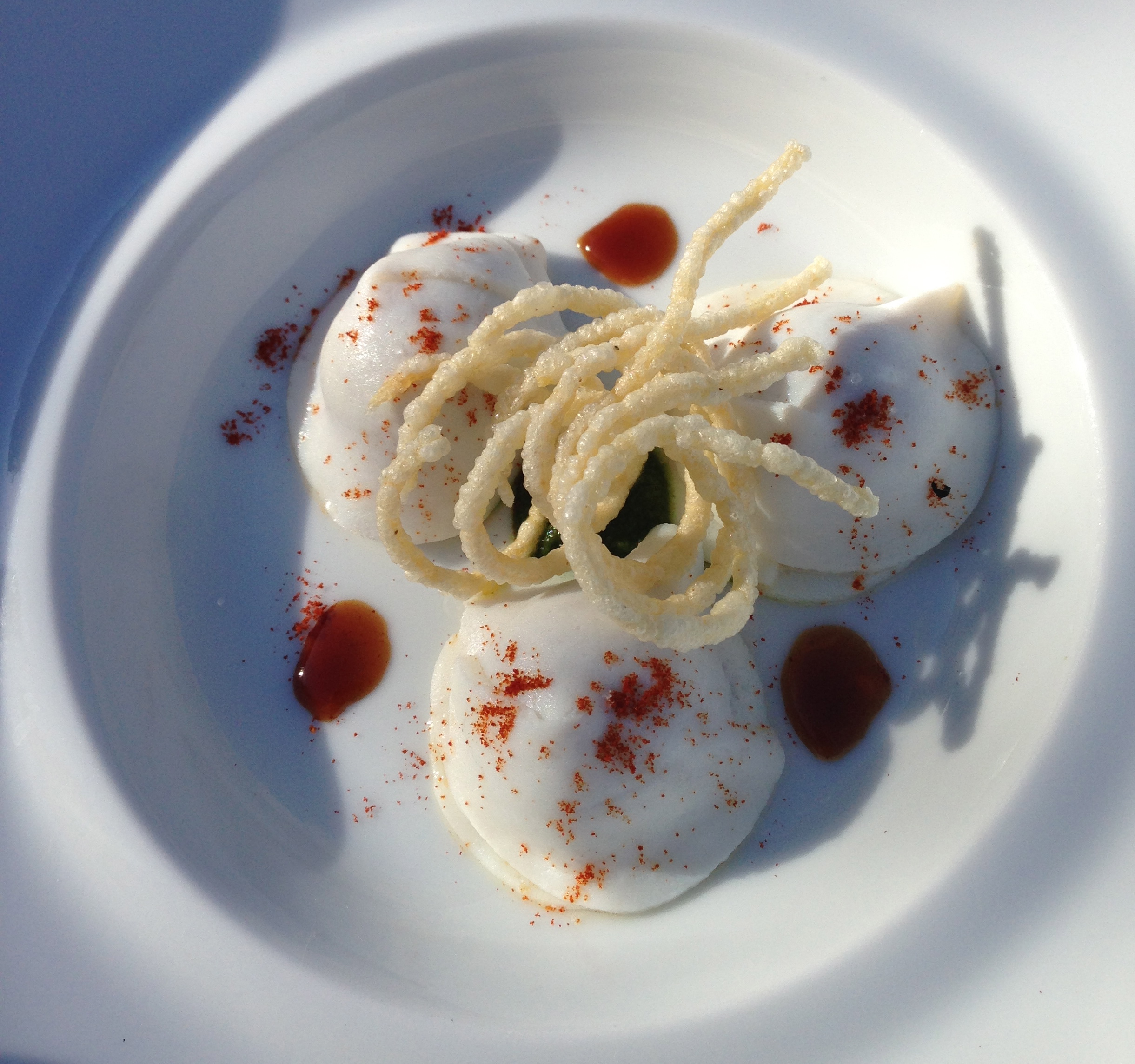 This is a dumpling pasta made from squid, it is the skin of the squid that he uses to form the exterior shell, inside is a filling made of various local seafood.