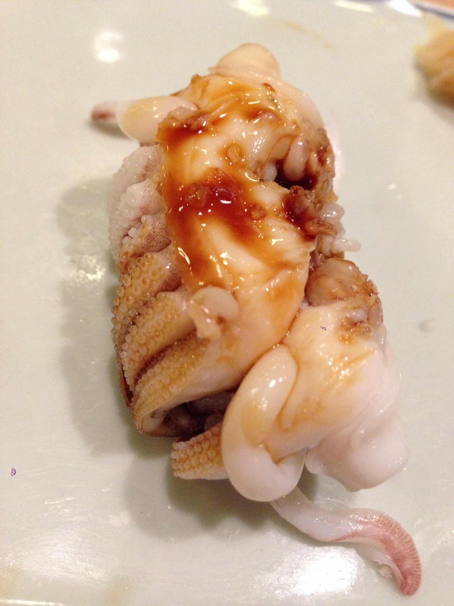 This is a part of the squid that many people do not have the opportunity to try. This is what we call the tentacles of the Squid which are quickly boiled and then preserved until they are ready to be served during a course of sushi. If you look carefully at the photograph you can notice the very small suction cups which are part of the tentacles, which are one very well-preserved in this photograph and add to the texture and taste of the Geso.